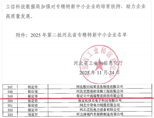 保定立中高端智造科技有限公司通過河北省專精特新中小企業(yè)認定